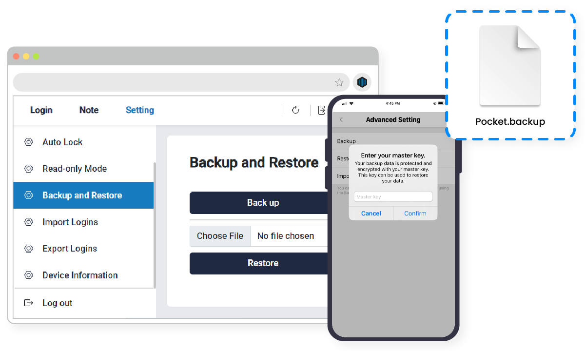 The backup and restore feature ensures you don't have to worry about losing your device. Simply back up your data on PasswordPocket regularly, and you can restore it to another device in case of loss, ensuring you effortlessly continue to use it without any interruptions. Furthermore, your backup data is encrypted to prevent unauthorized access by third parties.