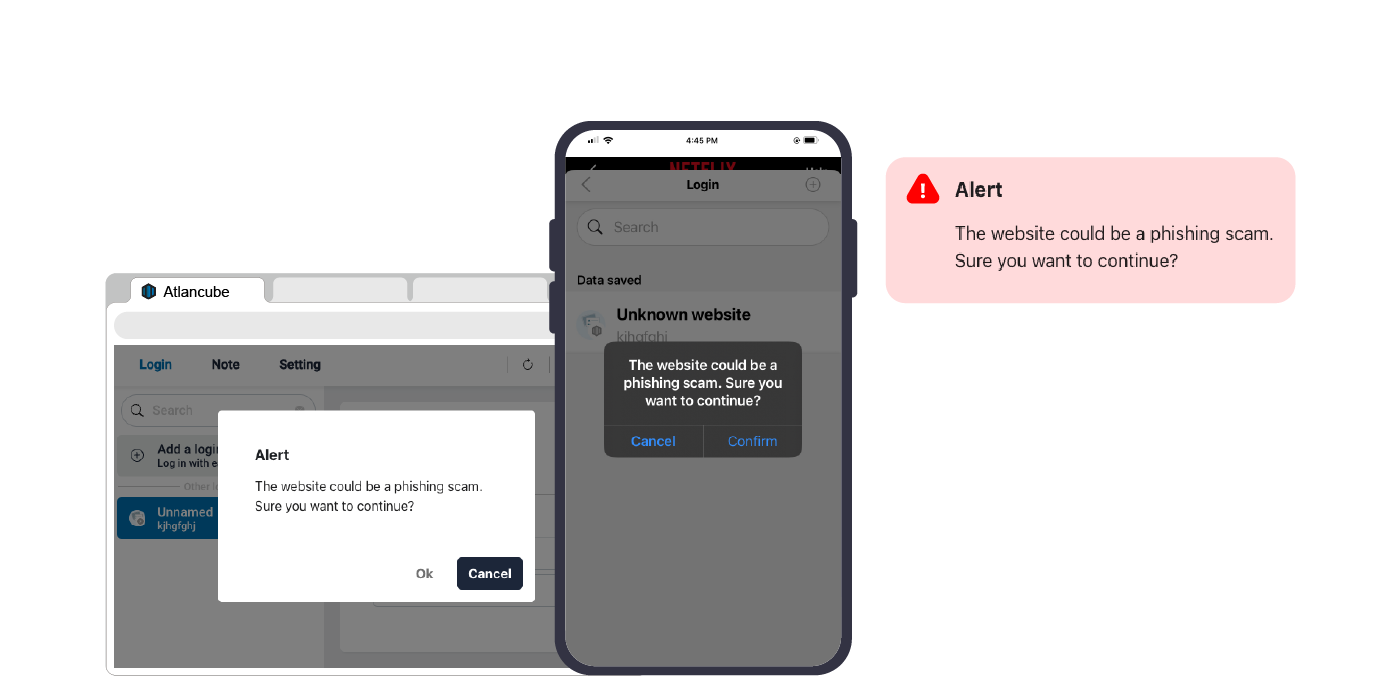 PasswordPocket protects users from phishing attacks by verifying the URLs of websites and identifying fraudulent sites. A pop-up notification will immediately appear as a practical reminder when you attempt to log in to a website that is different from your previous login.