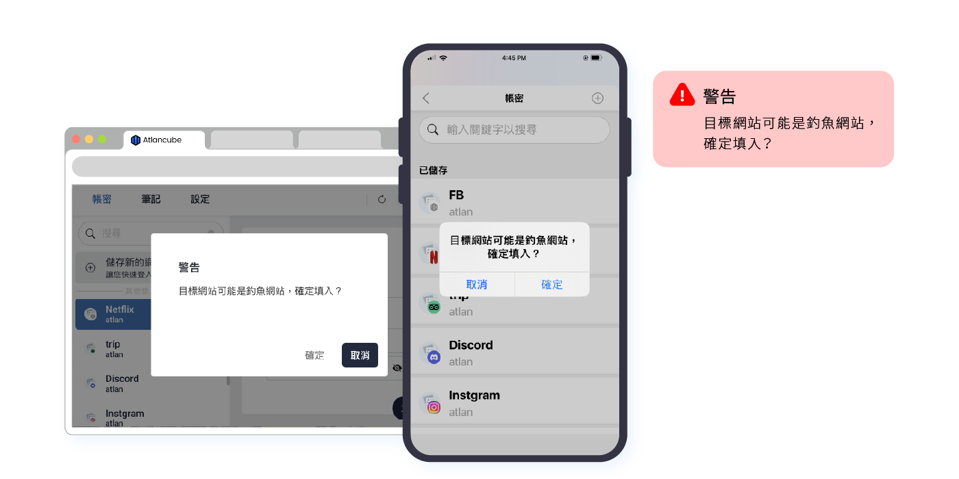 透過釣魚網站偵測功能,PasswordPocket 會偵測你欲登入的網址,若網址有疑慮,你會獲得即時的警告,避免你誤入偽網站。
